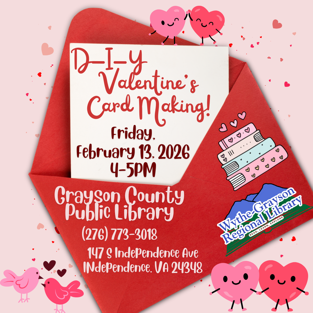 Come join us at the library to make DIY Valentine's Day cards! We will provide all materials, and everyone is invited! Date: Frida y, February 13th Time: 4-5pm Location: Grayson County Public Library Questions? Call us at (276) 773-3018!