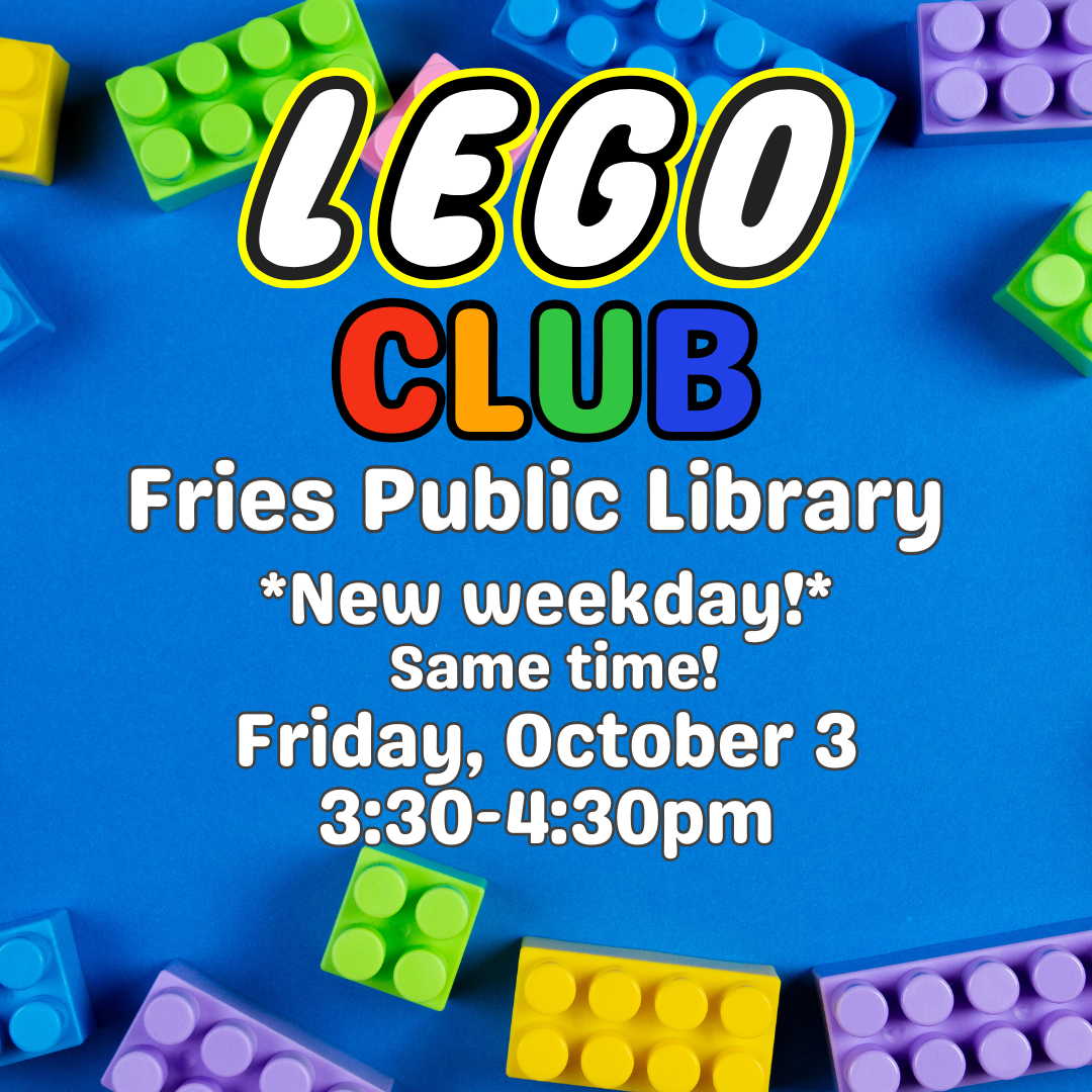 Join us for LEGO club at Fries Public Library! Come by on the first Friday of every month to for fun with LEGOs! You can find us in the Fries Community Center, at 105 W. Main Street in Fries, VA 24330. Call us with any questions at (276) 744-2225! |